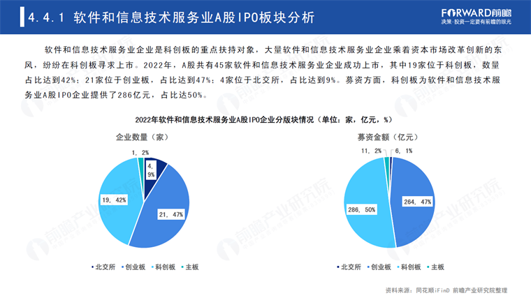 从科创板募资情况来看,软件和信息技术服务业企业是科创板的重点扶持对象,科创板为软件和信息技术服务业A股IPO企业提供了286亿元,占比达50%,大量软件和信息技术服务业企业乘着资本市场改革创新的东风,纷纷在科创板寻求上市。