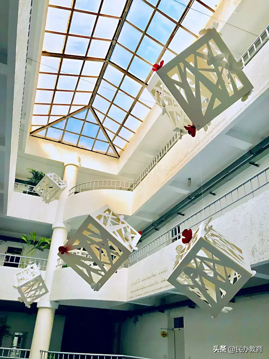 海宝校区有一个被教学楼围起来的半露天空间,走进去就像置身一幅画卷中,四周的墙被设计成粗糙的颗粒感,屋顶悬挂垂下的镂空正方体嵌着很多纸蝴蝶,像是要飞出来,它有一个雅致的名字:蝶变。