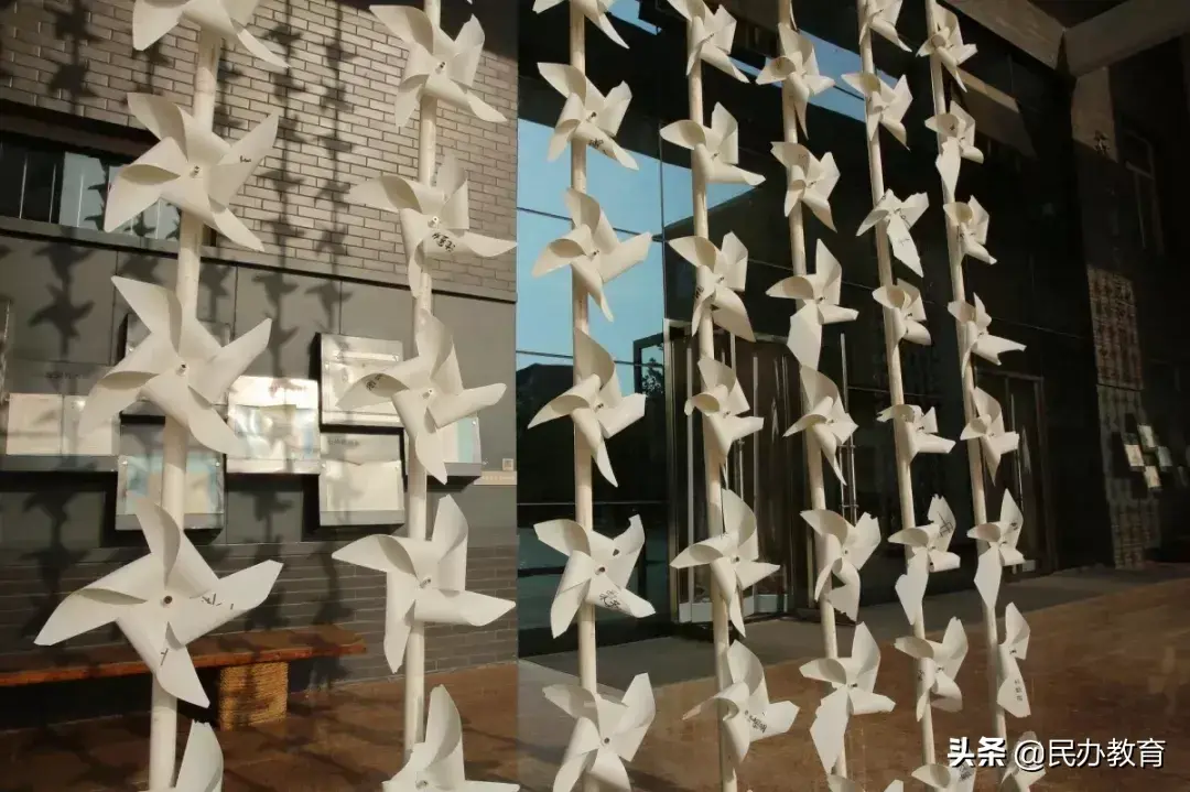 观湖校区门前灰色的空心砖里展示着孩子们的作品,主题是“生如夏花”,如果有作品被风吹下,看见的同学一定会小心捡起来放回原处;夏风轻抚,白色的“风车墙”就转了起来,而风车里“住”着孩子的名字。