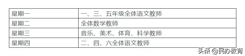 回二集团采用“连横策略”的方式,建立教师教研共同体,涵盖所有校区、所有学科、所有年级、所有课堂,组成了不同校区同一学科的16支教研团队,6支语文,6支数学,音乐、体育、美术、科学各1支。每两周都要举办一次教研活动(教研安排见下表)。